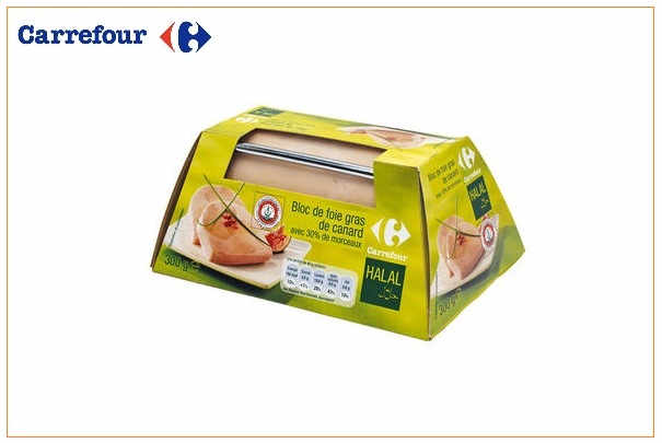 Les magasins Carrefour lance leur nouvelle marque de produits halal. Baptisée tout simplement Carrefour Halal, la gamme propose en tout premier lieu son bloc de foie gras de canard élaboré par le fabricant Delpeyrat et certifié halal par la mosquée de Paris.