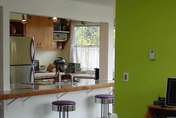 . sur les murs : tracer une courbe, une diagonale ou deux ou trois horizontales de hauteurs différentes directement sur un pan de mur et peindre chaque partie dans une teinte colorée ou pastel opposée au blanc