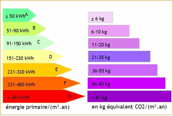 Afin de pouvoir s’y repérer, vous trouverez ci-dessus un schéma d’équivalence (lettre = énergie primaire/(m² par an) = en kg, soit en CO²/(m² par an).