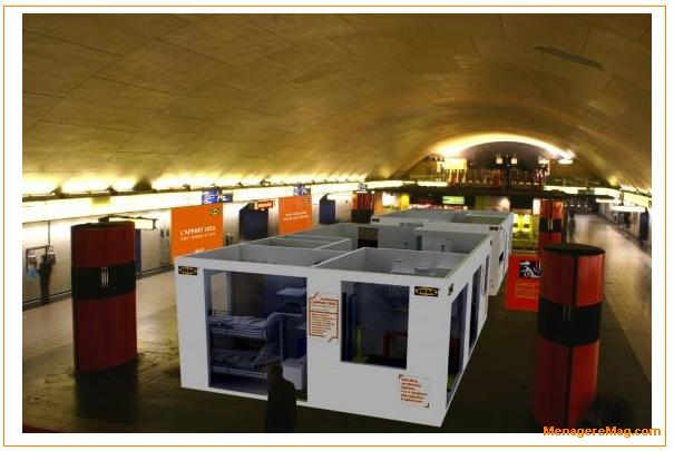 Après les canapés dans les abris bus parisiens en 2010, Ikea inaugure ce lundi 9 janvier 2012 son appartement-témoin à la station de métro et de RER Auber à Paris (dans la zone centrale des échanges).