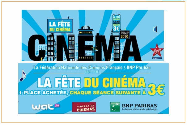 On notera la prolongation de la Fête du Cinéma jusqu’au 9 juillet 2010 chez BNP Paribas, partenaire national de la semaine du cinéma. Clients et prospects de l’établissement bancaire pourront ainsi profiter de 300.000 contremarques offertes (dont 100.000 à gagner directement sur le site de la banque). Ces contremarques permettront de profiter d’une place de cinéma à 3 € sur présentation du pass de la Fête du Cinéma.