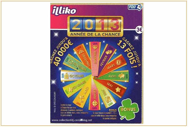 Après l’or en 2010, le rêve en 2011 ou encore la richesse en 2012, le ticket a été baptisé 2013 année de la chance puisque le 13 représente pour bon nombre de français un chiffre porte-bonheur. Le billet est vendu au prix de 3 €.