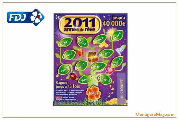 La Française des Jeux inaugure un nouveau billet de grattage. Baptisé 2011 année de rêve, ce jeu sera vendu à partir du jeudi 16 décembre 2010 au prix de 3 € le ticket.