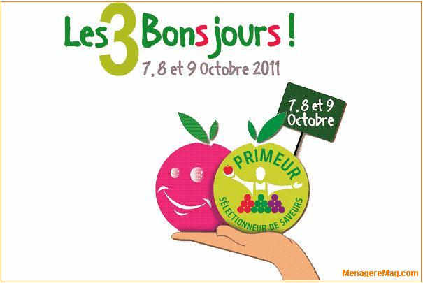 Du vendredi 7 au dimanche 9 octobre 2011 se déroulera l’opération Les 3 Bons Jours. A l’initiative de l’Union nationale des syndicats de détaillants en fruits, légumes et primeurs, cet événement donne l’occasion aux primeurs et aux maraîchers de France (500 participants) de procéder à des ventes flashs afin de pouvoir écouler leurs productions de fruits et légumes de saison.