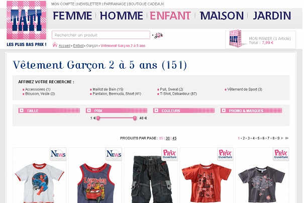 Pour le moment, le site de Tati propose quelques 7.000 références de produits (hommes, femmes, enfants, maison, jardin) qui seront élargis à 15.000 d’ici la fin de l’année 2010, à des prix bas tout au long de l’année.