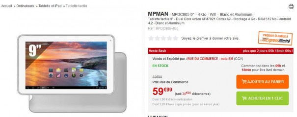 Parmi les différents sites de E-commerce qui vendent des produits high-tech nous avons sélectionné rueducommerce.fr qui propose des soldes sur différents produits high-tech comme par exemple les télévisions à -20%, les ordinateurs à -12% ou encore les tablettes à -33%. Parmi ces tablettes à -33%, on vous recommande la tablette Android Mpman – MPDC905 qui a une taille de 9 pouces qui est en vente flash jusqu’à demain pour seulement 59,99€.