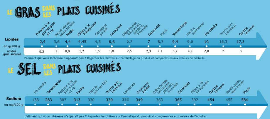 1. comparer, dans une famille de produits, les teneurs en sucre, en sel et/ou en gras (exemple ci-dessous avec les matières grasses et le sel contenus dans les plats cuisinés tous prêts) ;