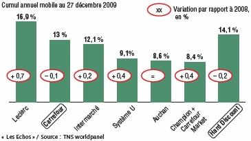 Selon l’étude de Référenseigne de TNS Worldpanel, les supermarchés Leclerc ont gagné 0,7 % de part de marché au niveau des ventes de produits de grande consommation courante et libre service frais en 2009 par rapport à 2008.