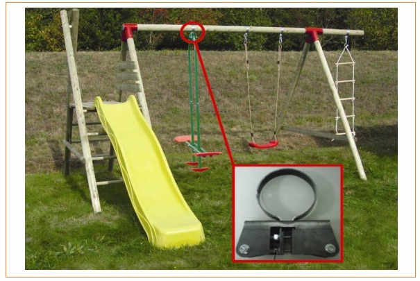 Ce portique en bois se compose d’un toboggan, d’une échelle de corde, d’une balançoire simple et d’une balançoire vis-à-vis. C’est au niveau de la pièce métallique reliant ce vis-à-vis à la poutre central que se situe la défectuosité.