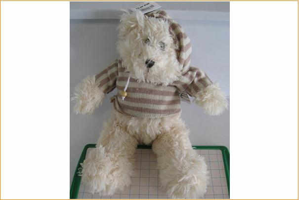 Les Autorités procèdent au rappel et au retrait du marché d’ours en peluche vêtu d’un pull rayé blanc et beige à capuche avec un cordon de perles en bois aux extrémités et importés en provenance de Chine par la société Alldeco Bvba.