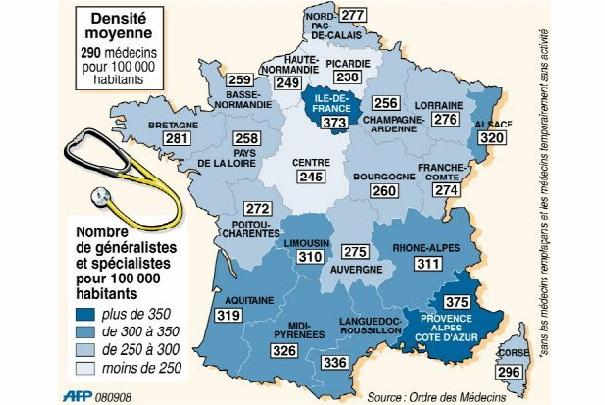 Le constat de l’Ordre des médecins montre qu’au 1er janvier 2009, la moyenne française était de 290 médecins pour 100.000 habitants alors qu’elle était de 300 pour 100.000 au 1er janvier 2008.