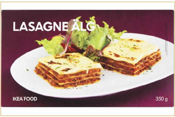 Les magasins Ikea ont procédé samedi 6 avril 2013 au retrait à la vente de barquettes de 350 g de lasagnes à base d’élan Lasagne älg de la marque Ikea Food (produites par la société suédoise Dafgaard) commercialisées dans ses épiceries.