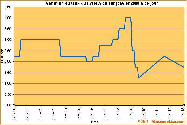 Variation du taux de rémunération du Livret A de 2000 à 2013 22/01/2013 A compter du 1er février 2013, le taux de rémunération du Livret A sera rabaissé à 1,75 % net, revenant ainsi à son [...]