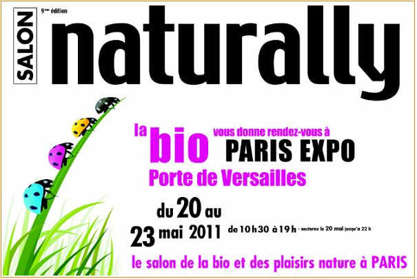 La 9e édition du Salon Naturally dédié au bio et aux plaisirs nature se déroulera du vendredi 20 au lundi 23 mai 2011 à Paris, Porte de Versailles, Pavillon 5.2.