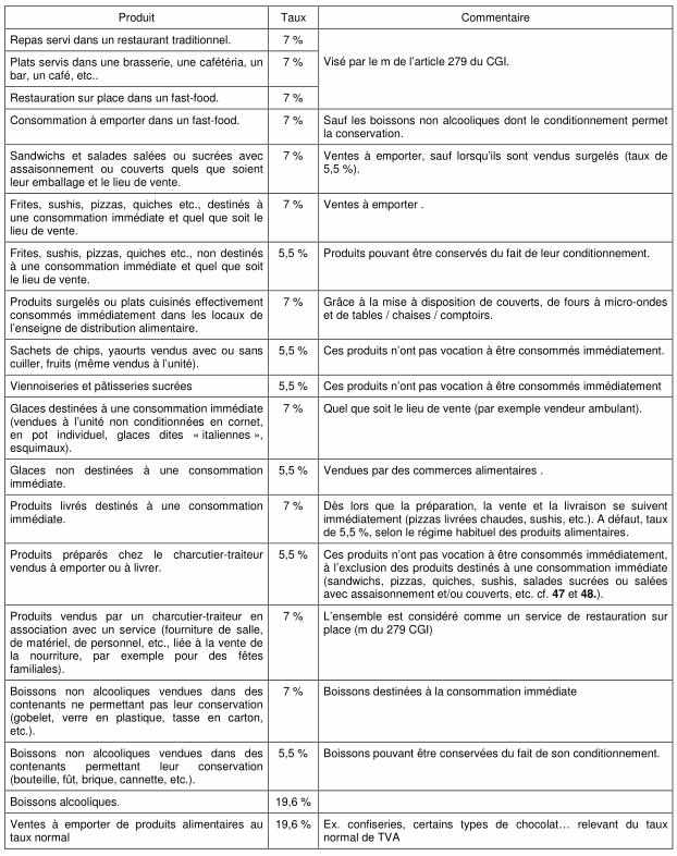 2. taux de TVA réduite pour les ventes à emporter ou à livrer (cliquer sur l’image pour l’agrandir) :