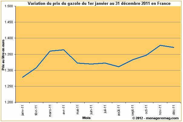 Le prix moyen au cours de l’année 2011 du gazole s’est élevé à 1,334 € (contre 1,195 € en 2010, 1,003 € en 2009 et 1,265 € en 2008). avec quelques disparités de coût suivant les mois, selon les données de l’Union française des Industries Pétrolières (UFIP).