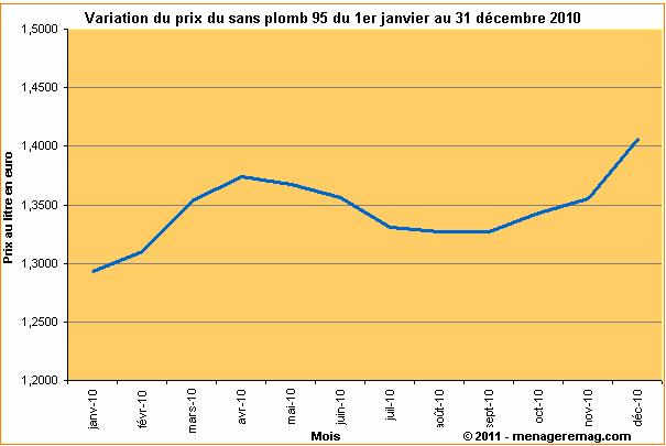 Les relevés hebdomadaires de l’Union française des Industries Pétrolières (UFIP) relatifs aux prix au litre du super sans plomb indice 95 (SP95) permettent d’établir la variation sur l’année 2010 qui vient de s’achever.