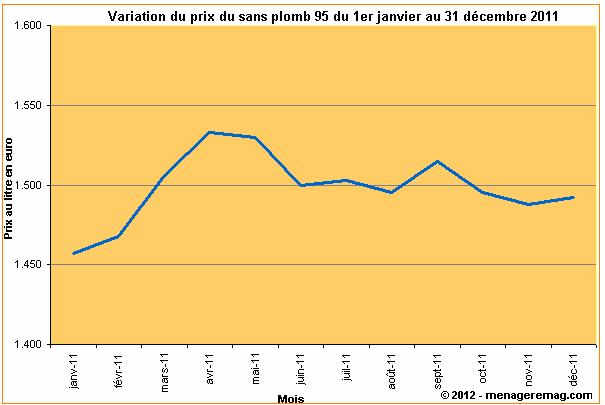 Entre le 1er janvier et le 31 décembre 2011, le coût d’un plein d’essence SP95 pour un réservoir de 70 litres a oscillé entre 102 € en janvier 2011 où les prix étaient les plus bas et 107,31 € en avril 2011 où les coûts étaient les plus élevés. Soit une différence de 5,31 € par plein ce qui correspond à un peu plus de 3,5 litres de SP95 au prix moyen de 2010.