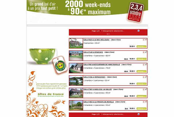 90 € le week-end en Gîtes de France, du vendredi 2 au dimanche 4 octobre 2009 jusqu’à 6 personnes. Et 120 € pour les propriétés de 7 à 12 personnes (charges non incluses pour certains gîtes).